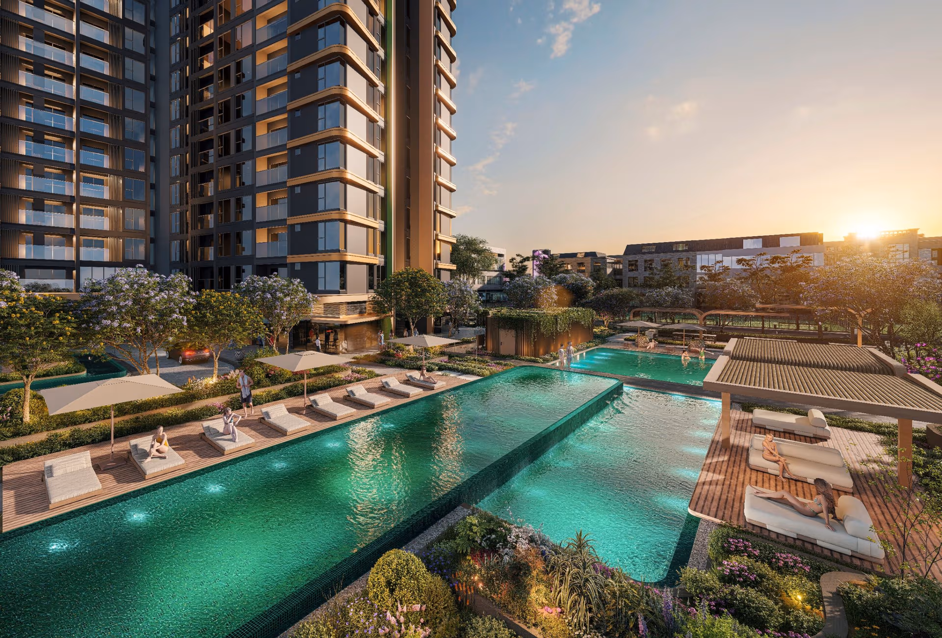 Chất sống thanh tao tại Lumiere Essence Peak còn được phản chiếu thông qua từng góc không gian cảnh quan – Nơi mà 23 tiện ích ngoài trời “có một không hai” được quy tụ trong một không gian xanh nghệ thuật, mở ra những trải nghiệm sống mới mẻ tới cộng đồng tinh hoa nơi đây. Đó chính là cụm bể bơi ngoài trời người lớn – trẻ nhỏ – jacuzzi nằm liên hoàn được thiết kế theo phong cách “resort”; lounge thư giãn & không gian cafe ngoài trời nằm xen kẽ giữa những khu vườn cây rợp bóng; hoặc những sân bóng bàn, sân pickle ball, sân chơi trẻ nhỏ gắn kết các thành viên mọi lứa tuổi.