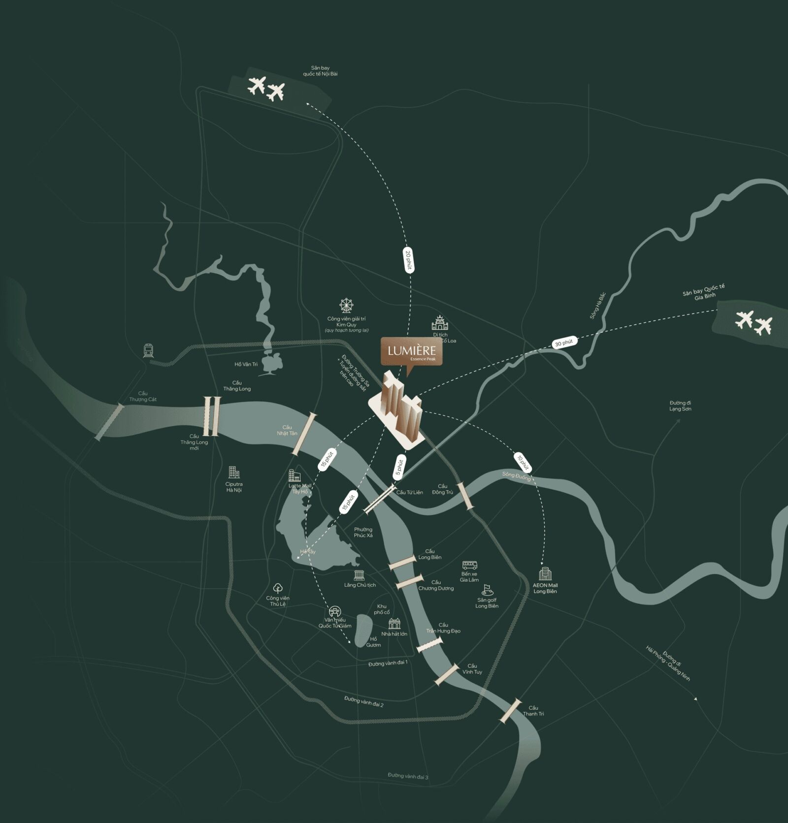 - 20 phút: Đến sân bay Nội Bài và Vinhomes Riverside