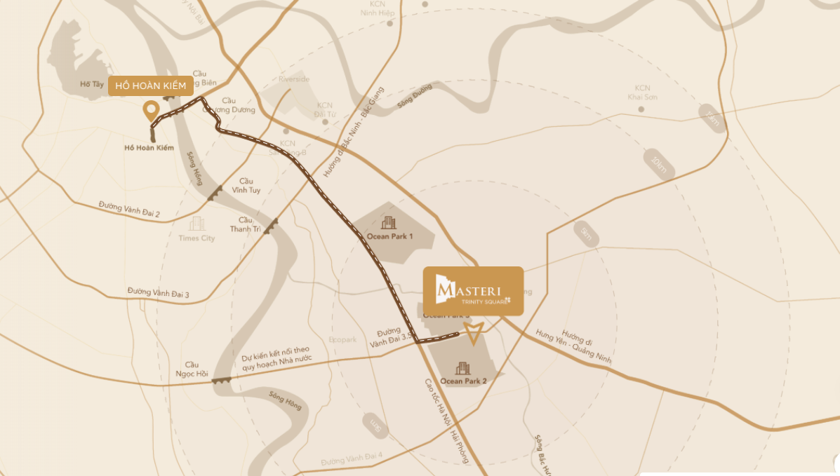 Từ Masteri Trinity Square cư dân có thể dễ dàng di chuyển tới các tỉnh thành phố lân cận như Hải Phòng, Quảng Ninh, Bắc Giang, Bắc Ninh, Hưng Yên, Vĩnh Phúc, …qua các trục cao tốc 5A và 5B, đón đầu đường Vành đai 4 trong tương lai.